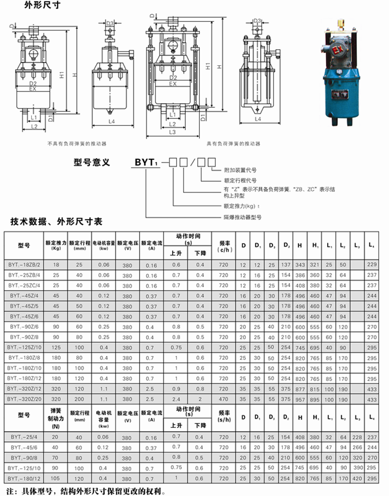 BYT1推動器' >電力液壓推動器隔爆型主要用于YWZ系列操動閘瓦式制動器,作為起重、運輸、行車等一切類似驅(qū)動裝置的機械制動用。