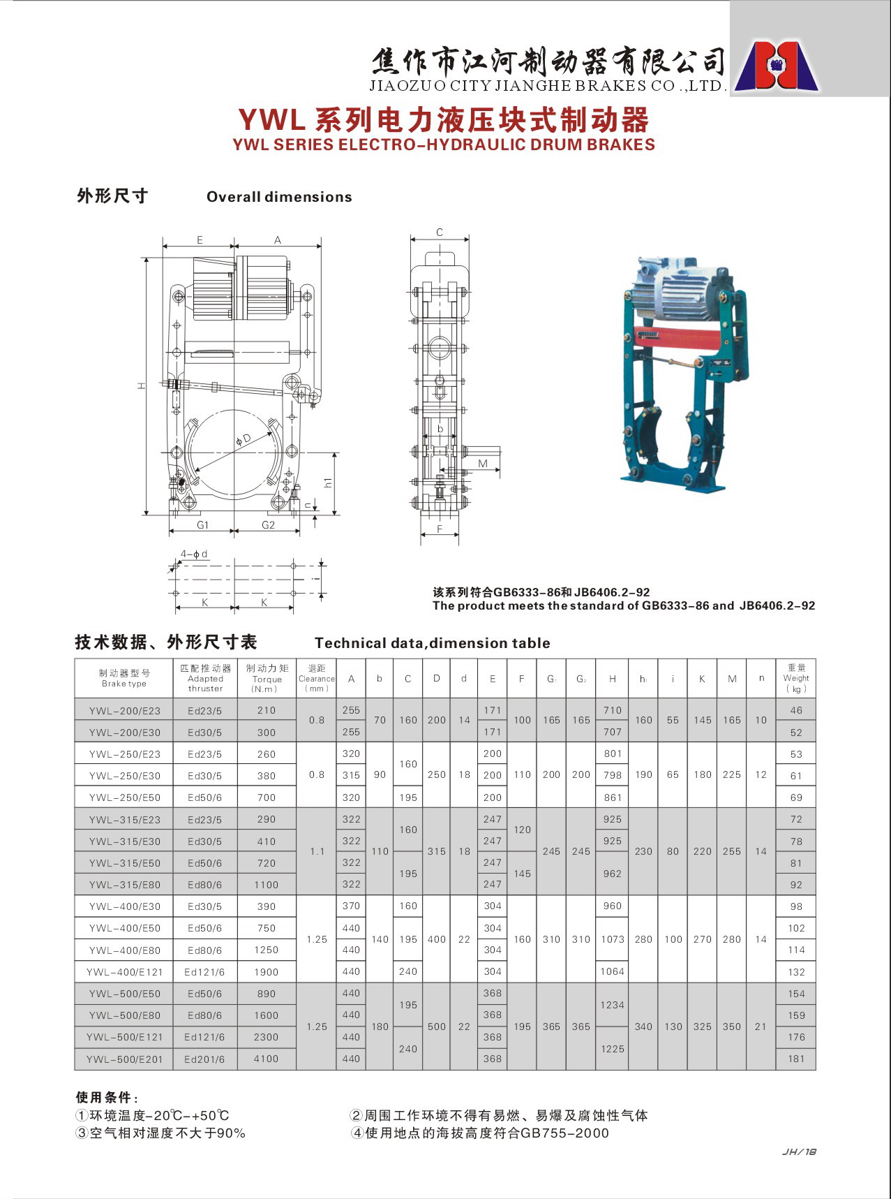 YWL電力液壓塊式制動器主要用于起重、運(yùn)輸、冶金、礦山、港口、建筑機(jī)械驅(qū)動裝置的機(jī)械制動,具有制動平穩(wěn),安全可靠、維修方便、耗電少、延長壽命、低噪音等優(yōu)點(diǎn)。